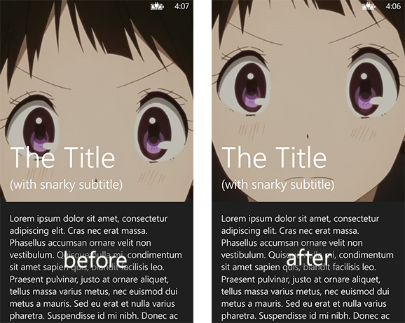 You’ll have to settle for the (albeit slight) performance decrease if you want this effect—you’ve probably already noticed that sometimes the header image stutters. You’ll also have to settle for some sporadic bugs that I’ve noticed, including the ScrollViewer getting “stuck” in the squished state, or it jumping to the top or the bottom if you flick randomly.